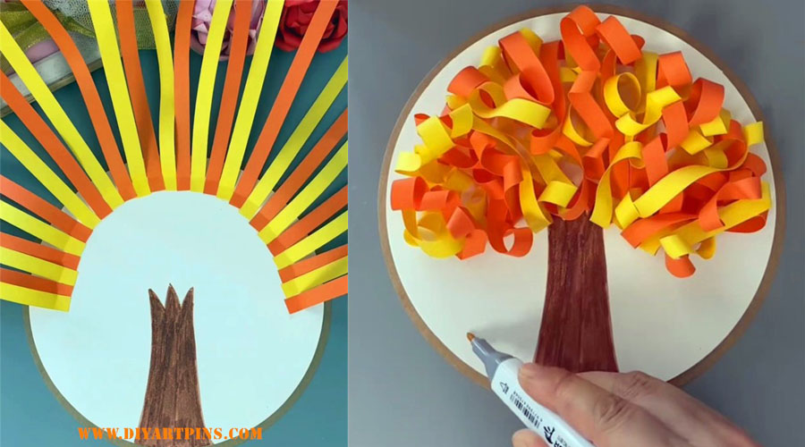 Step 5: After each strip of paper is manipulated in this way, the leaves look very lush and a fall tree is ready. Then use a marker to draw some weeds under the tree, doesn't it look better?